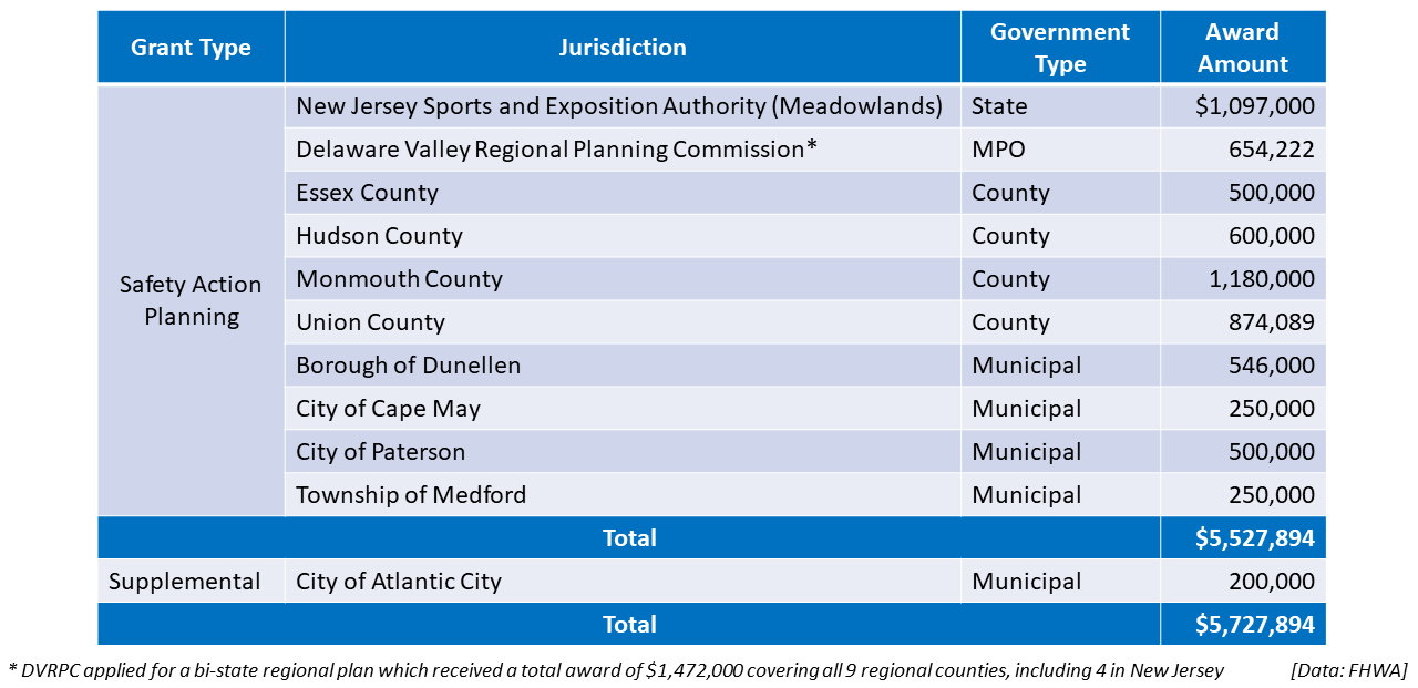 There are many safety action planning activities in the State of New Jersey, either in progress or soon to begin, at the county level or higher. Thanks to last year’s SS4A grant applications, eight of New Jersey’s 21 counties have already been awarded grant funding to produce Safety Action Plans. While the Delaware Valley Region Planning Commission (DVRPC) has covered its entire region with a Safety Action Plan using SS4A funds, both the North Jersey Transportation Planning Authority (NJTPA) and the South Jersey Transportation Planning Organization (SJTPO) have committed to making other funding available to produce county-wide Safety Action Plans for counties who wish to participate.